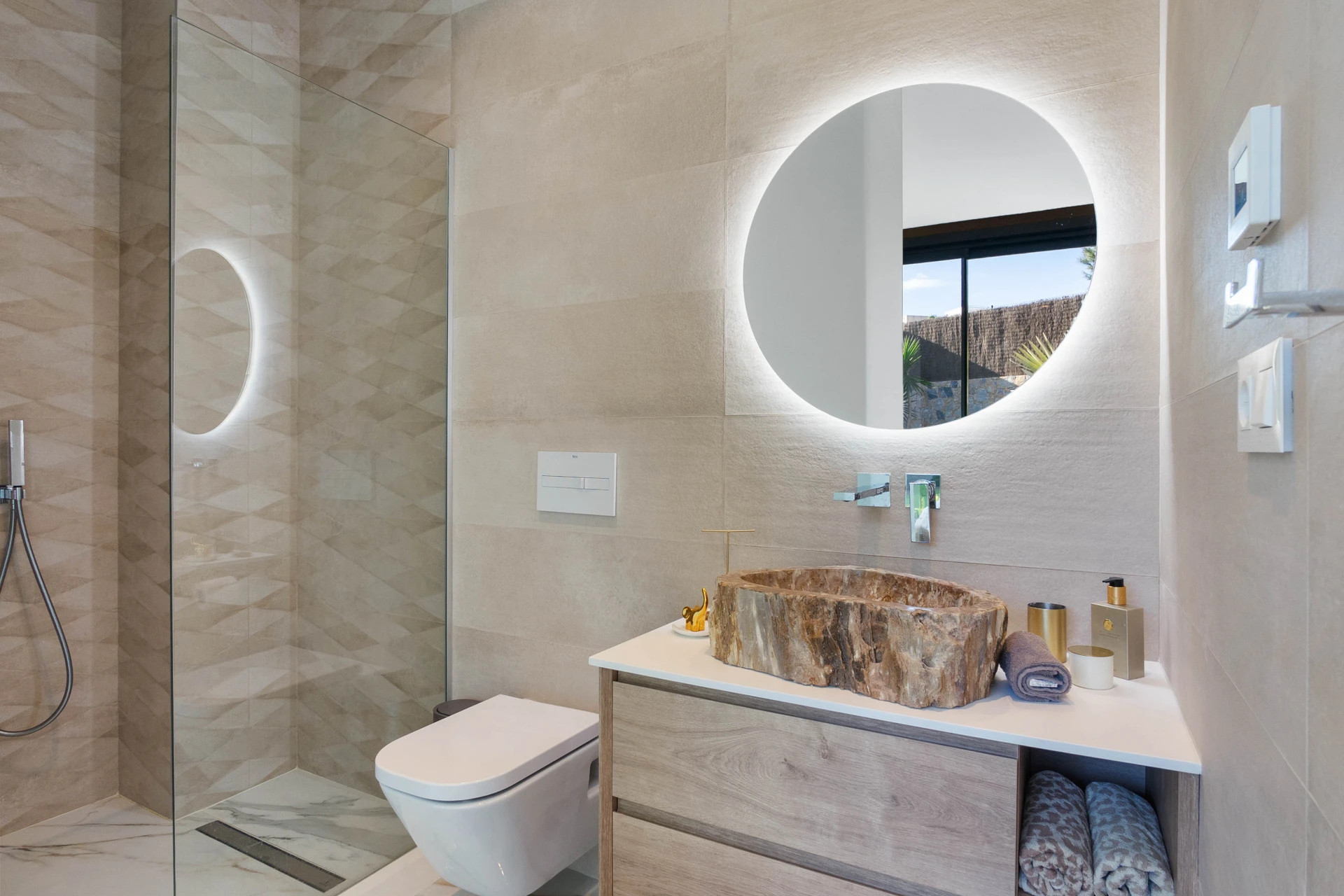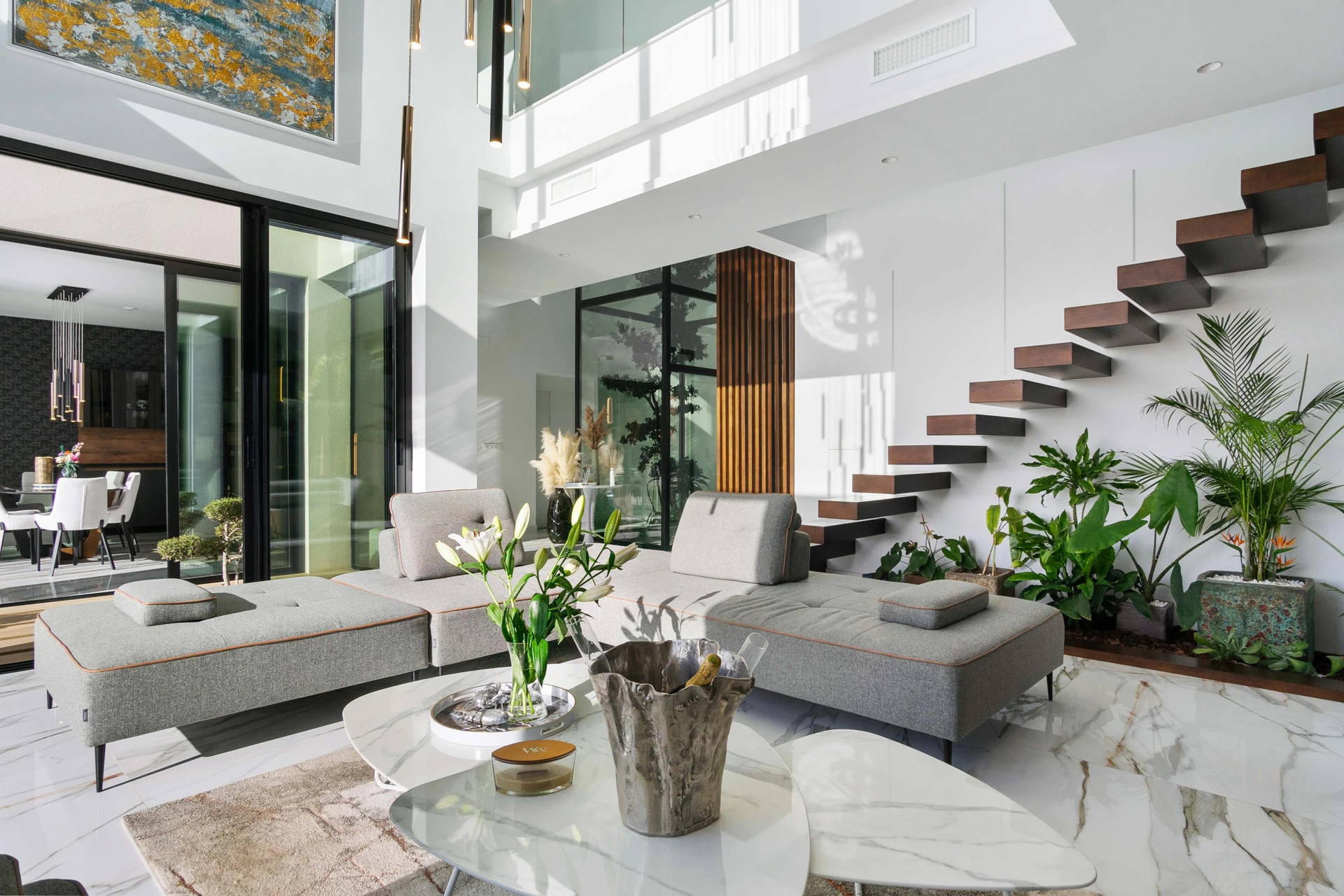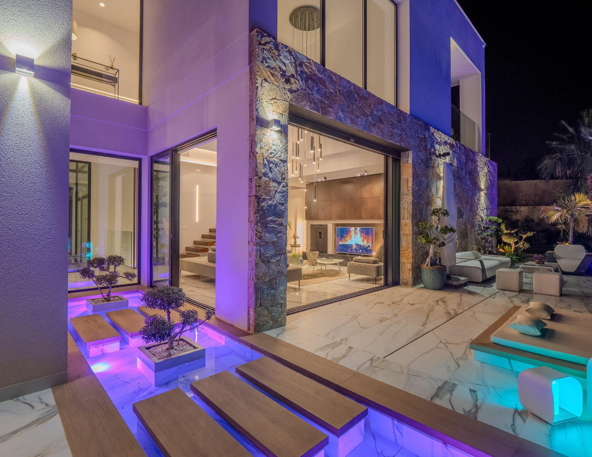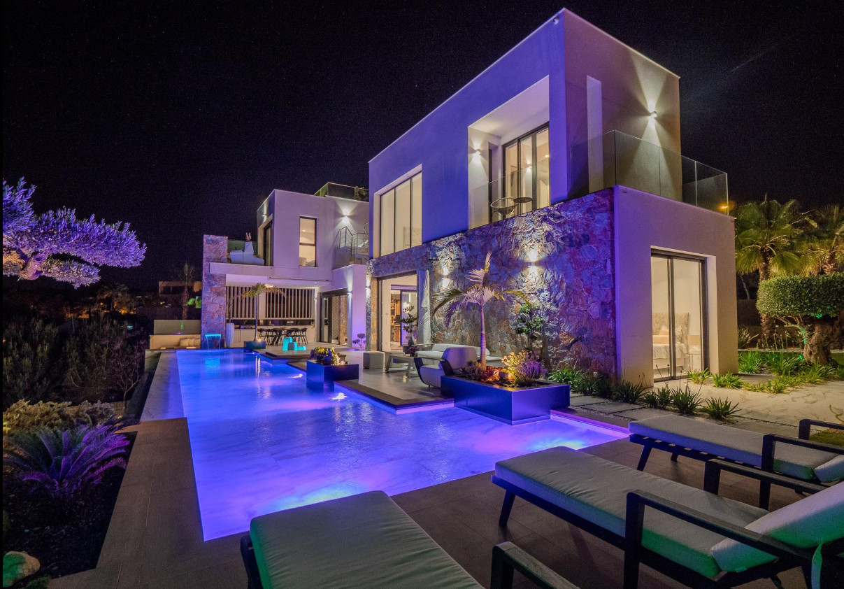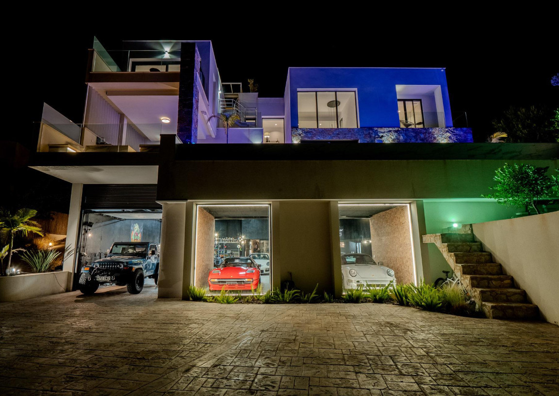 Welcome to this stunning, exclusive, modern villa that combines contemporary design with the warmth of a home, offering an exceptional lifestyle for both daily living and holiday stays. With 550 m² built on a 1,300 m² plot, the property redefines the concept of luxury thanks to its impeccable architecture, the quality of its materials, and the serenity conveyed by its spaces. Its four bedrooms with en-suite bathrooms, all equipped with underfloor heating, along with an additional toilet, elevator, four kitchens, solarium with jacuzzi, climate-controlled wine cellar, and a spectacular collector's garage, make this villa a unique residence. Upon entering the home, an impressive Japanese interior garden with Ficus trees sets the serene character of the house and leads into an open-concept living-dining room flooded with natural light. The main kitchen, of avant-garde design and equipped with top-of-the-range appliances, is complemented by a secondary kitchen that facilitates service and organization. This floor opens onto a spacious outdoor terrace featuring an elegant outdoor kitchen, lounging and dining areas, and a 16 × 3 meter infinity pool that harmoniously integrates into the landscape. The outdoor fireplace and private golf practice area add a distinctive touch to this space conceived for relaxation and entertainment. This floor also houses a bedroom with an en-suite bathroom and direct garden access, ideal for guests or those who prefer a ground-floor space. On the first floor, accessible by both the floating wooden staircase and the elevator, the double-height ceilings and floor-to-ceiling windows offer panoramic views that elevate the visual experience. Here, two exceptional bedrooms are located. The first features a private balcony, built-in wardrobes, a workspace, and an elegant en-suite bathroom also with underfloor heating. The master suite constitutes a true sanctuary, with a spacious walk-in closet, a luxurious bathroom with a separate bathtub and shower, underfloor heating, and a balcony from which to enjoy the stunning views of the golf course. From this floor, you access the solarium, an intimate space with a private jacuzzi and open views of both the golf course and the distant sea. The semi-basement floor completes the home with a guest studio offering a private bedroom, living and dining area, and an en-suite bathroom with a shower and underfloor heating. Floor-to-ceiling windows allow a direct view of the spectacular garage, creating a unique atmosphere for car enthusiasts. This level also incorporates a leisure area equipped with a kitchen and dining room, perfectly connected to the 12-car garage, conceived as a true exhibition gallery. Ambient lighting throughout the exterior, zoned climate control, underfloor heating in bathrooms, solar panels, and 24h surveillance reinforce the comfort and efficiency of this residence, designed for those who value excellence in every detail. The villa is located in Las Colinas Golf & Country Club, one of the most exclusive and awarded residential resorts in Spain. Situated in a natural valley of 330 hectares surrounded by hills and protected areas of Mediterranean forest, this resort stands out for its low construction density, privacy, and an exceptional natural environment. Its internationally recognized 18-hole golf course is considered one of the best in Europe and forms the heart of a sophisticated and tranquil lifestyle. The resort also offers sports facilities, a golf academy, tennis and padel courts, walking trails, high-quality restaurants, and a private beachfront beach club. All of this creates an ideal environment for those seeking exclusivity, nature, and an incomparable quality of life. Overall, this villa represents a unique opportunity for those who desire a luxury residence where architecture, design, privacy, and a privileged natural setting unite to offer an unparalleled living experience.