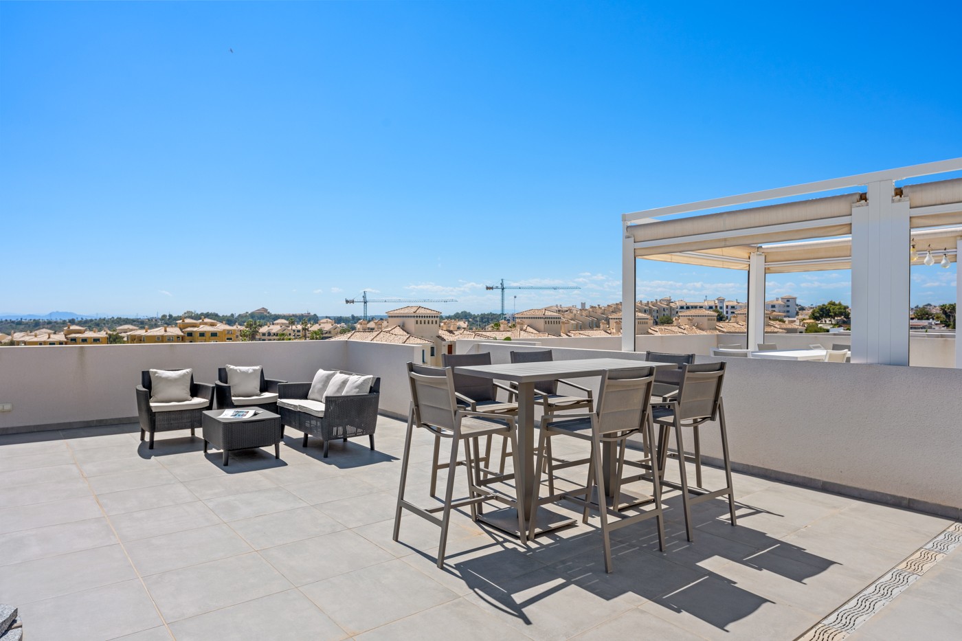 Discover this beautiful penthouse in a recent new-build development located in the sought-after area of Campoamor, Orihuela Costa, specifically close to Villamartín. This privileged location is surrounded by three excellent golf courses (Villamartín, Las Ramblas and Campoamor) and offers stunning distant sea views, while shops, restaurants and all amenities are within walking distance. The penthouse enjoys sunshine all day long and features a very spacious terrace, ideal for making the most of outdoor living and the views. In addition, there is a private solarium where you can relax in peace with panoramic views, even of the sea. The property is sold fully furnished and finished to high quality standards, including air conditioning and underfloor heating in the bathrooms. It also includes a private underground parking space and a practical storage room. The residential complex offers a beautiful communal garden with palm trees and various plants, as well as a swimming pool and jacuzzi—perfect for relaxing in a pleasant and green environment. Thanks to its excellent location, you are only 10 minutes away from the beautiful beaches of Campoamor and Cabo Roig, and close to the popular Zenia Boulevard shopping centre. Alicante and Murcia airports are easily accessible within approximately 45 minutes. This penthouse is the ideal investment, both for holidays and permanent living, where comfort, luxury and location come together perfectly.