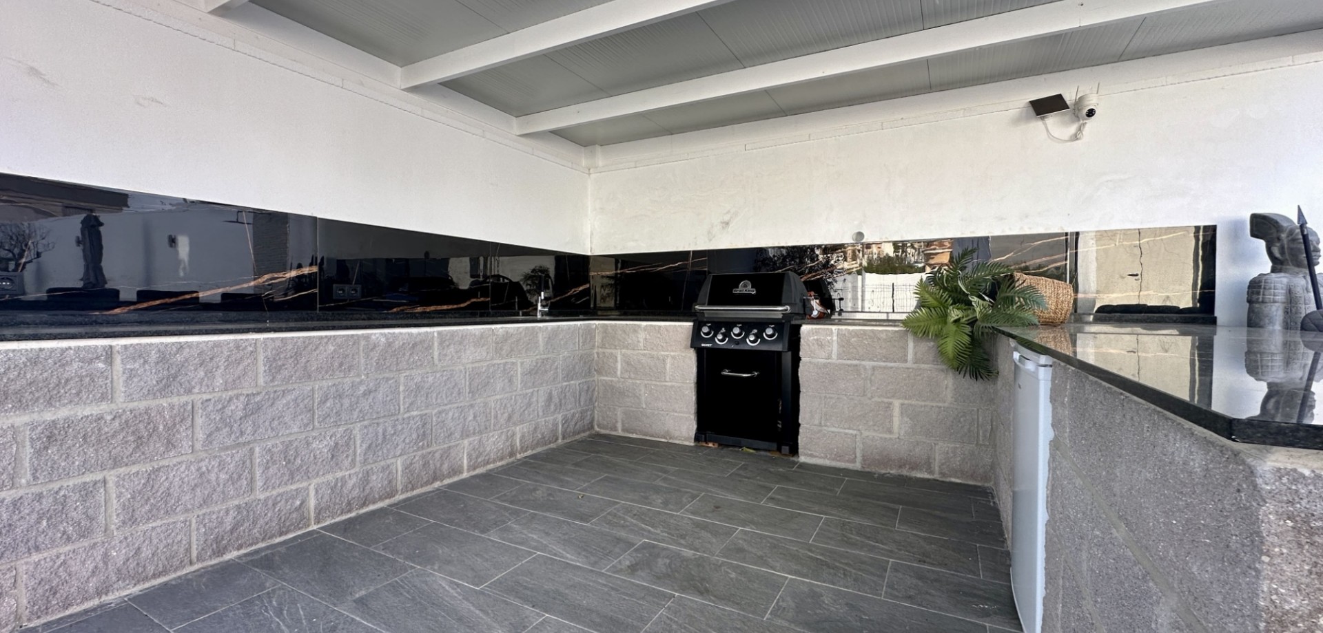 Externally, the home boasts an elegantly landscaped garden with paved terraces designed for outdoor living and entertaining. A standout feature is the private heated pool (8 × 4 m), providing year-round enjoyment. The outdoor space also includes a covered exterior kitchen/bar area, ideal for al fresco dining and social gatherings.