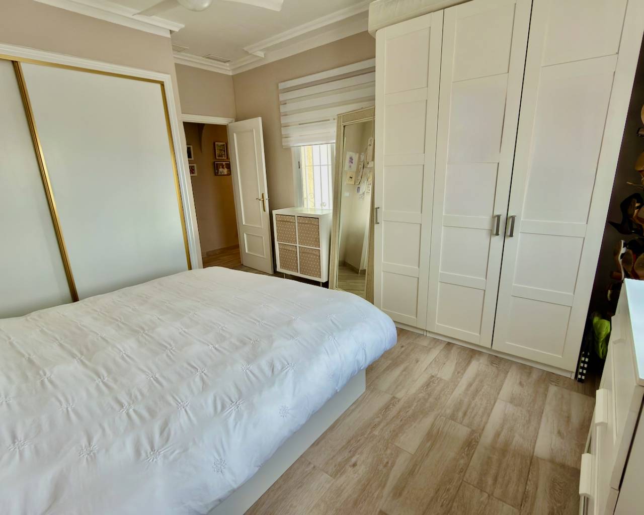 The villa features three spacious bedrooms, all with built-in wardrobes, including a beautifully appointed master suite with en-suite bathroom, offering privacy and comfort.